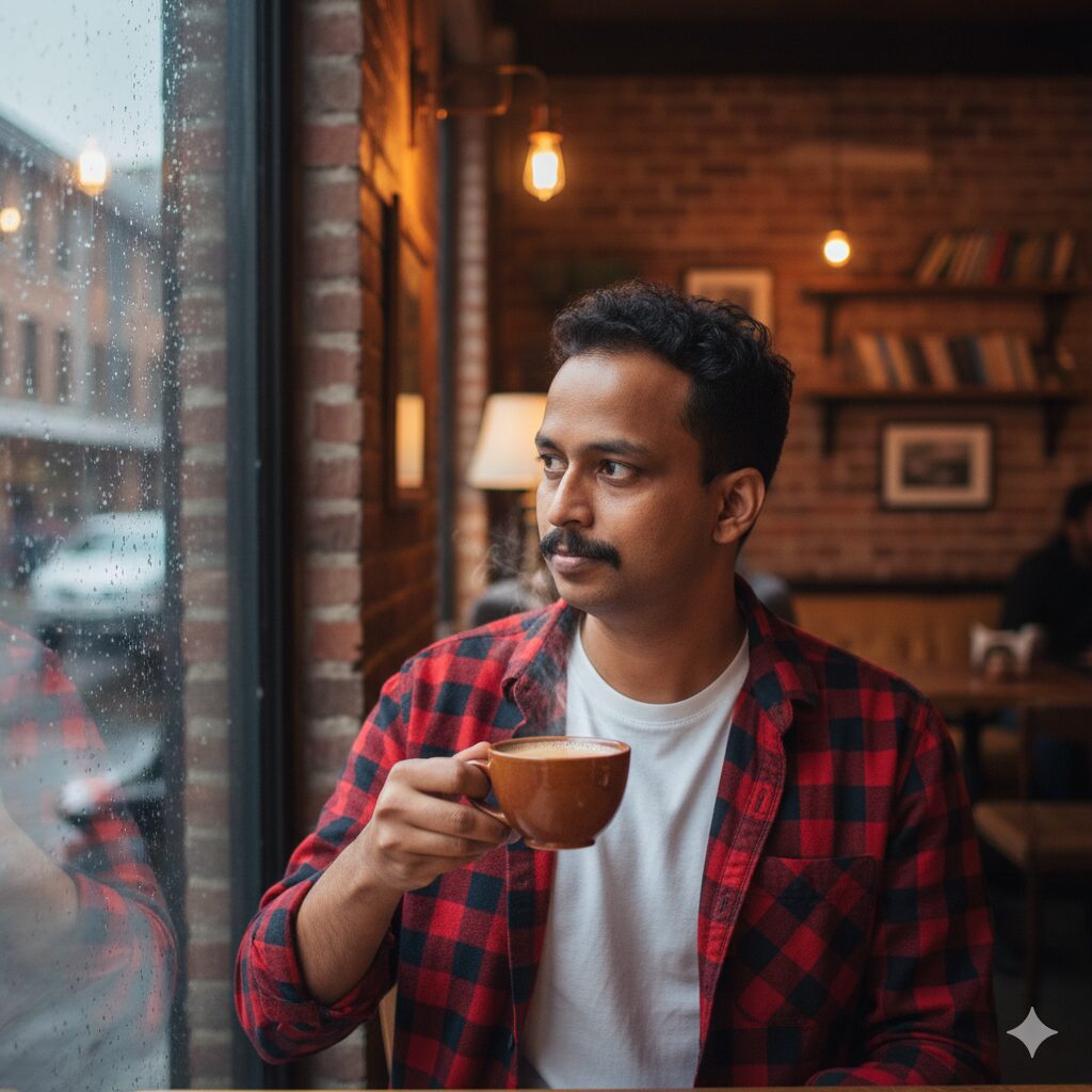 Convert into a 4K, ultra-realistic portrait of a young Indian man with the exact same face as the uploaded image (no alteration, 100% identical). He has short, curly dark hair. He is wearing a casual, open flannel shirt over a plain white tee. He holds a steaming cup of chai. He is looking out a window with a pensive, relaxed expression. The background is a cozy, rustic cafe with warm, ambient lighting. The overall mood is comforting and contemplative.