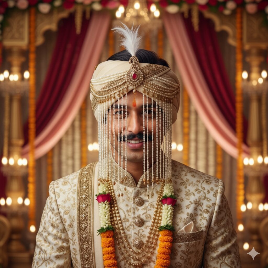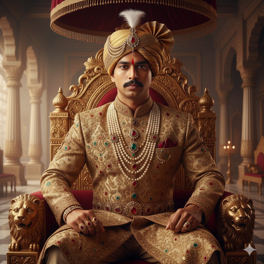 Convert into a 4K, ultra-realistic portrait of a young Indian man with the exact same face as the uploaded image (no alteration, 100% identical). He has neatly combed dark hair. He is wearing a traditional, richly embroidered maroon Sherwani with gold accents. He has a subtle, regal smile, looking directly at the viewer. The background is a grand, opulent palace interior, dimly lit by intricate chandeliers and soft, warm light. The overall mood is majestic and ceremonial.