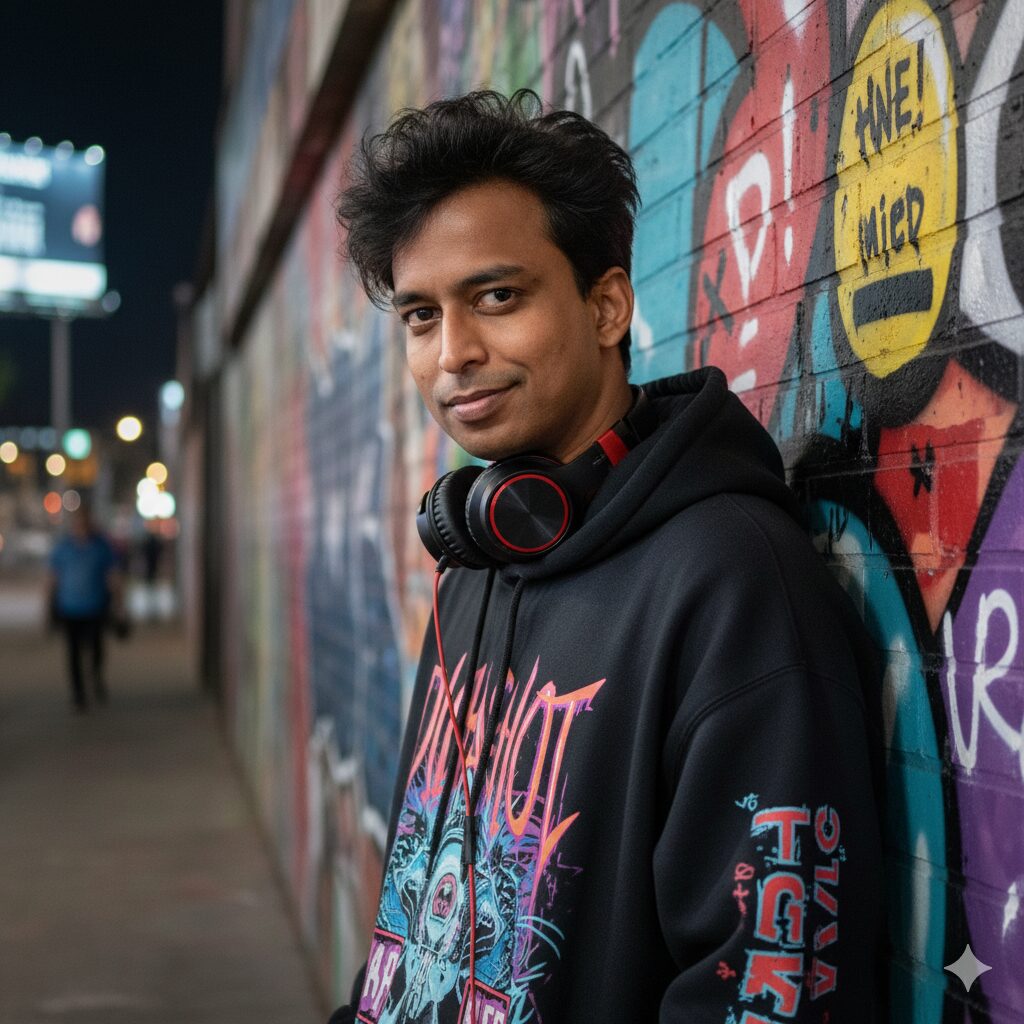 Convert into a 4K, ultra-realistic portrait of a young Indian man with the exact same face as the uploaded image (no alteration, 100% identical). He has messy, textured dark hair. He is wearing a comfortable, oversized graphic t-shirt and distressed jeans. He holds a vintage camera. He is looking slightly upwards with a curious, artistic expression. The background is a vibrant, graffiti-covered urban alleyway, illuminated by stark streetlights. The overall mood is edgy and creative.