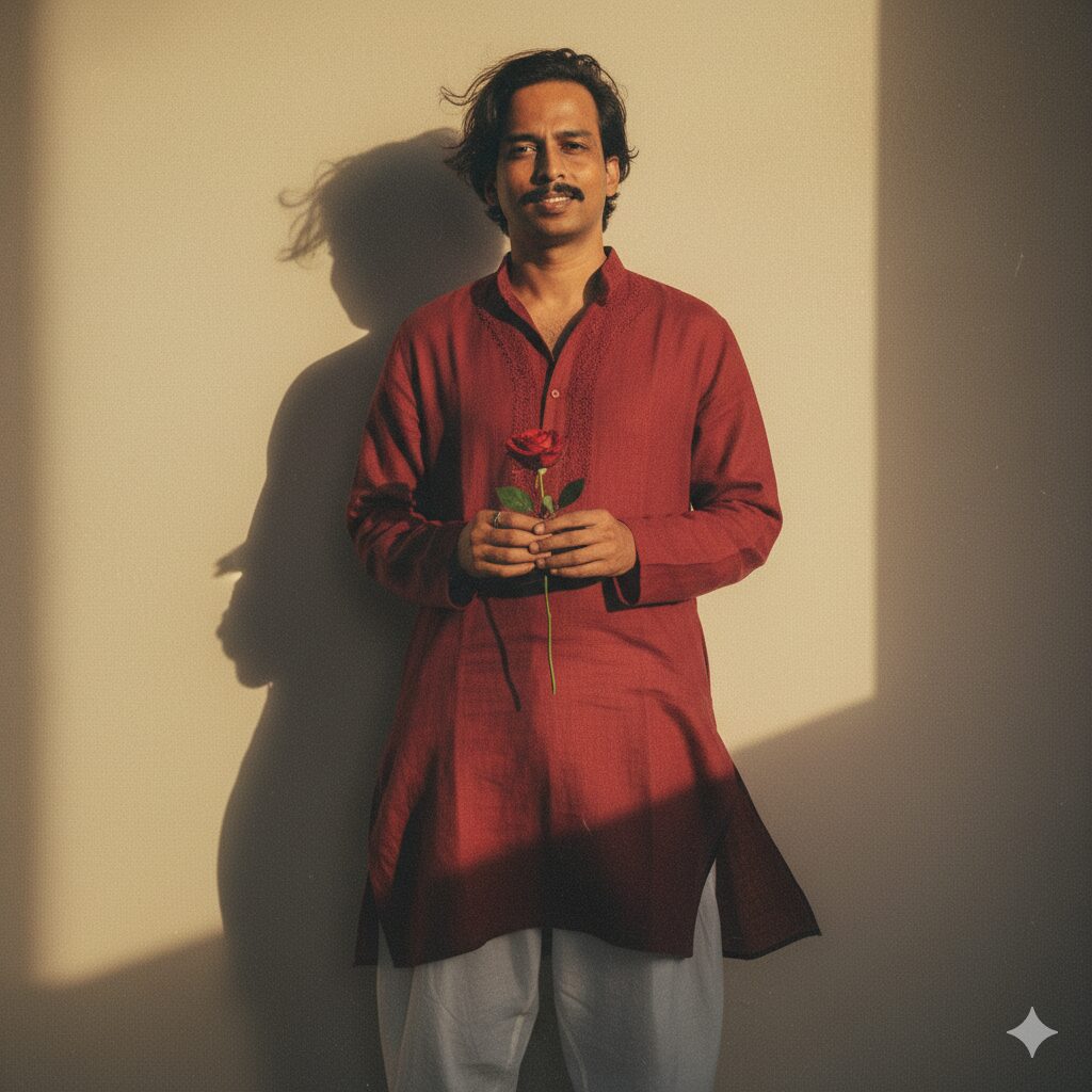 Create 4k a retro vintage cinematic portrait of the reference picture (no alteration, 100% identical). He is wearing a cream kurtha pajama, standing in front of a textured wall with peeling paint. He holds a rose in his hand, smiling faintly. The scene is nostalgic, cinematic, and poetic with warm golden light.