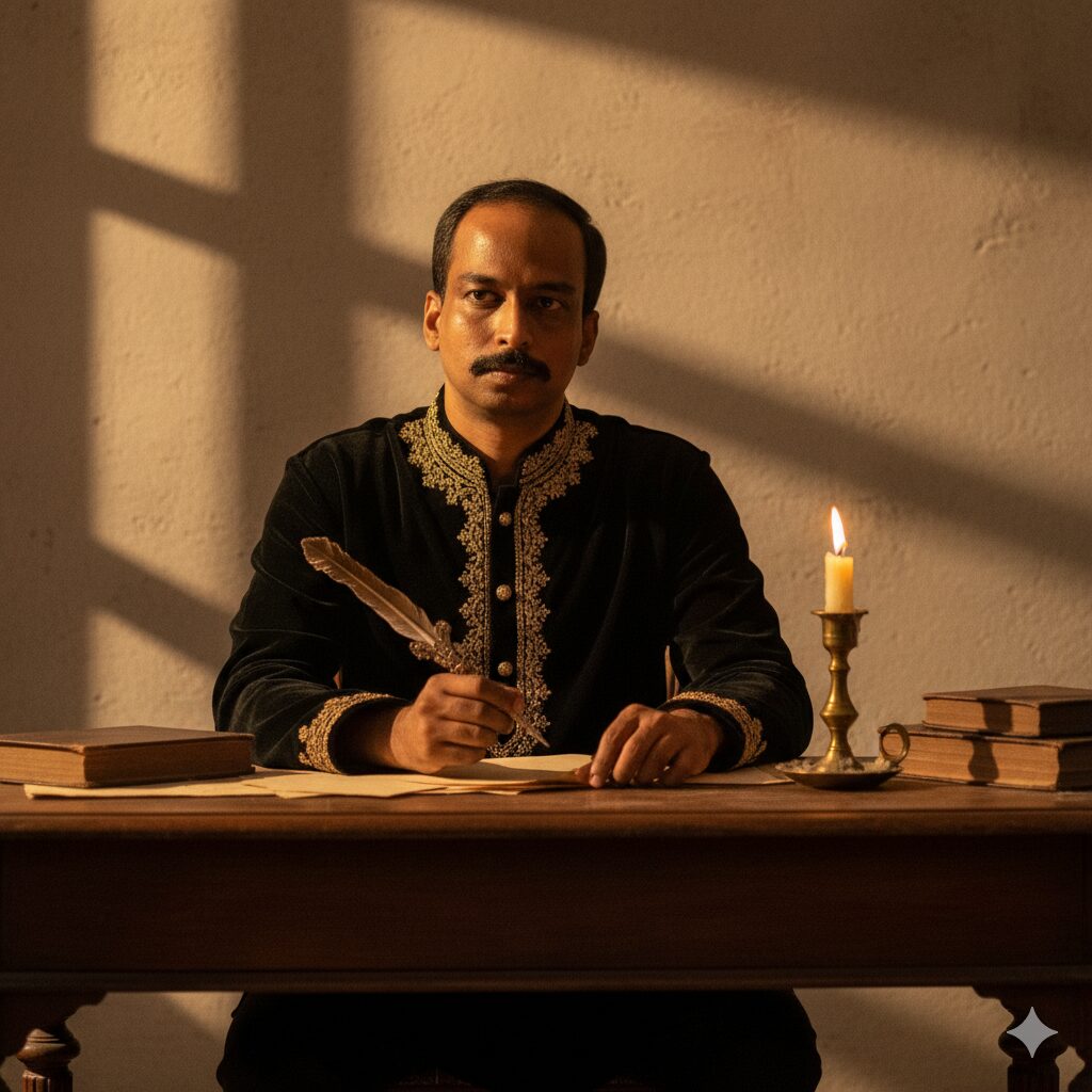 Create 4k a retro cinematic portrait of the reference picture (no alteration, 100% identical). He is dressed in a black kurtha with golden accents, seated at an old desk with a lit candle beside him. Shadows dance on the wall behind. He holds a quill pen as though writing a letter. The expression is deep and poetic. The atmosphere is dramatic and artistic like a period film.