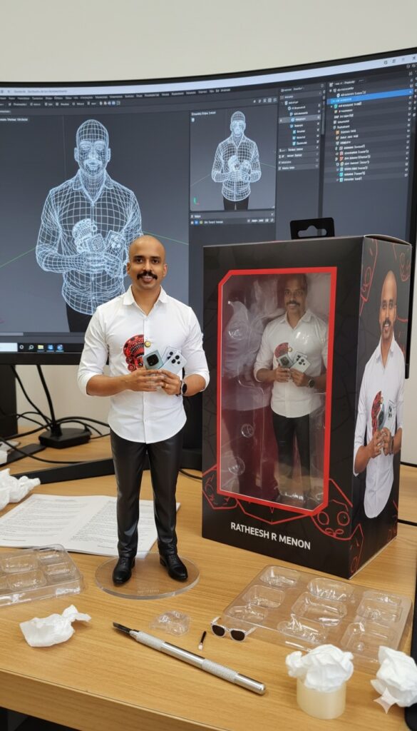 Next to the screen, there is a large toy packaging box labeled “YOUR NAME,” styled like a premium gamer collectible package.