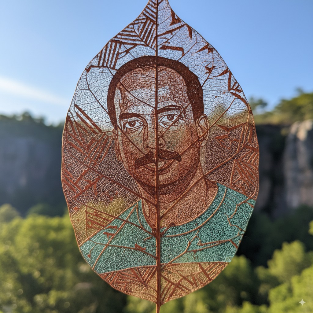 "Create an oval shaped dry leaf carving picture, with a ratio of 3:4, precision carving details form a portrait or object according to the photo reference. The leaves are carved so carefully that the light can penetrate the thin patterns on the surface of the leaves. The sculptures feature realistic silhouettes and details. Natural landscape background with clear blue sky, green trees or natural cliffs. Sharp focus on leaves, soft bokeh in the background, warm natural lighting, realistic, highly detailed, macro photography style. "