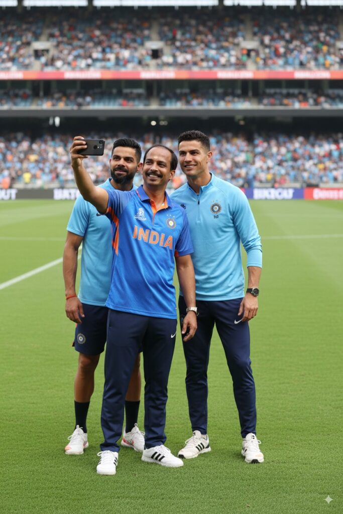 Photorealistic 4k image of standing on a bright, green football pitch, taking a close selfie with Cristiano Ronaldo and Virat Kohli. He is holding up a smartphone with one hand, smiling naturally. He is wearing an India Cricket shirt, blue pants, and white Adidas shoes. Cristiano Ronaldo and Virat Kohli stand close on either side of him, smiling casually into the camera like friends posing for a fun picture. The stadium in the background is filled with cheering fans, blurred slightly to keep focus on the selfie group. Bright daylight, realistic details, crisp shadows.