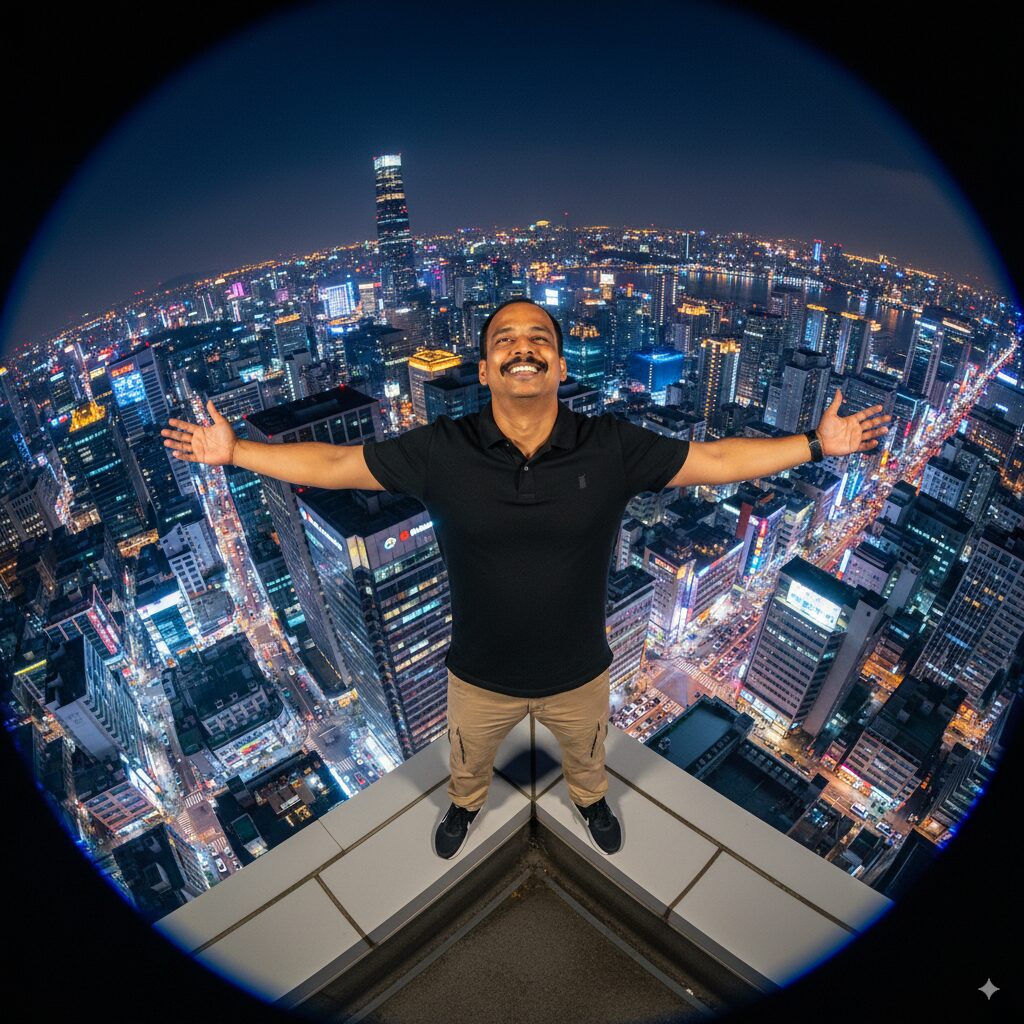 Change the background standing to the edge of a very tall skyscraper in the middle of a South Korean metropolis. He wears a plain black polo, beige cargos, and Black Nike sneakers. His arms are wide open, as if he's reaching out for a sense of freedom. The wide-angle camera captures a panoramic view of Seoul from above—the bustling streetlights and the sea of glowing buildings are visible. The camera's perspective is from above, and the 360⁰ wide-angle lens effect creates a dramatic perspective, highlighting the elegant and majestic urban atmosphere at night. City lights, neon rooftop lights. Modern, calm, and fashionable, with a metropolitan nighttime feel, tense yet cool, with natural nighttime lighting and sharp details like a DSLR photo. High resolution, 4:3 landscape ratio
